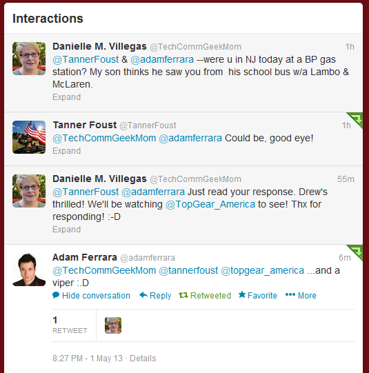 This afternoon, he told me that on his way home from school, at a specific intersection, he saw a red Lambo and an orange MacLaren, both with Top Gear license plates, and he swore he saw two of the co-hosts of Top Gear America, Tanner Foust and Adam Ferrara, plus a camera crew. My husband and I thought that maybe–just maybe–my son was joking with us, but he swore up and down that he knew what he saw. He even named the specific models (which I can’t remember or keep up with).